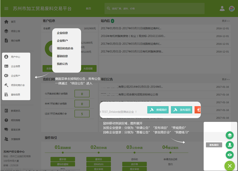 第一:首页方面,改版后,页面导航从头部改到左侧。业务规则、政策法规、操作指南、系统公告均挪到规则指南中。网页头部添加搜索框,可以直接搜索发布的公告与竞价结果。
