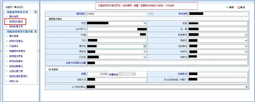 4. 完成计划基本信息填写后,完善废物性状描述,在这里废料编号,数量,数量单位均由竞价会自动获取,不可更改