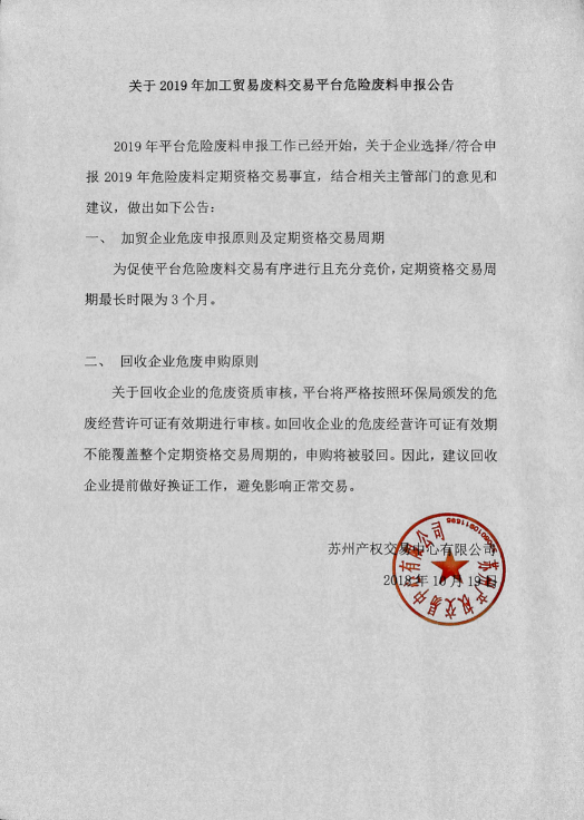 2019年平台危险废料申报工作已经开始,关于企业选择/符合申报2019年危险废料定期资格交易事宜,结合相关主管部门的意见和建议,做出如下公告: