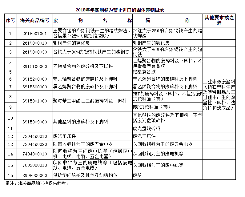 禁止进口固体废物:现行的《禁止进口固体废物目录》所列废物。详情点击 中国生态环境部公告